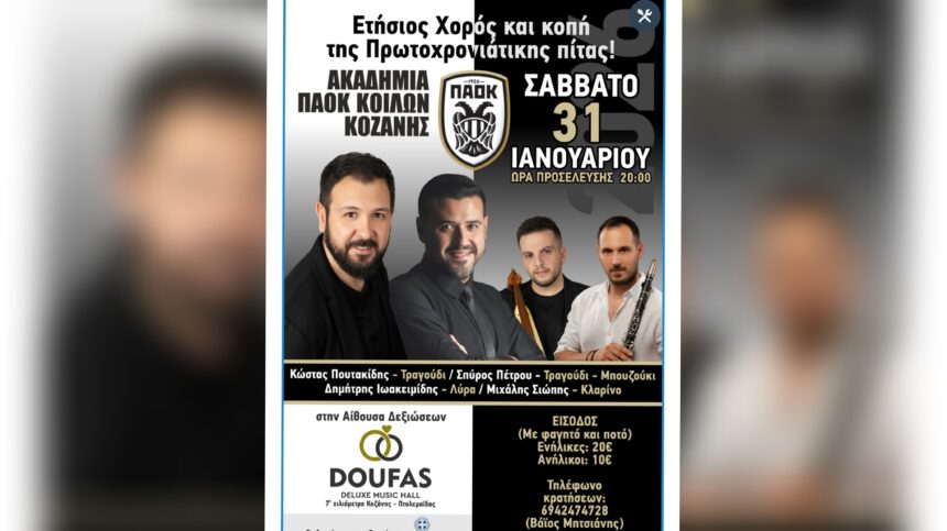 Η Ακαδημία ΠΑΟΚ Κοίλων Κοζάνης, σας προσκαλεί στον Ετήσιο Χορό και στην κοπή τηε Πρωτοχρονιάτικης πίτας, το Σάββατο 31 Ιανουαρίου 2026, στην Αίθουσα Δεξιώσεων «Doufas Deluxe Music Hall», στις 20:00, για μία ξεχωριστή αλλά και μουσική βραδιά!