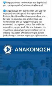 Ανακοίνωση εξέδωσε μετά το τέλος του αγώνα Εορδαϊκός Πτολεμαΐδας – Ακρίτες Συκεών η ομάδα των Ακριτών Συκεών διαμαρτυρόμενη για την διαιτησία του βοηθού επόπτη.