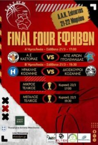 Η Ένωση Καλαθοσφαιρικών Σωματείων Δυτικής Μακεδονίας ανακοινώνει τη διεξαγωγή του Final Four Εφήβων, το οποίο θα πραγματοποιηθεί το Σαββατοκύριακο 21 και 22 Μαρτίου 2025 στο Δ.Α.Κ. Σιάτιστας.