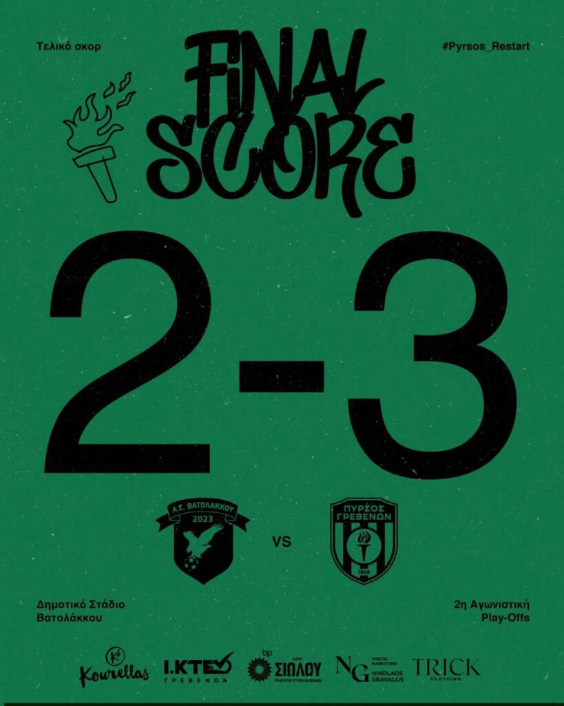 Ο Βατόλακκος μπήκε πιο δυνατά από τους πράσινους στο παιχνίδι και πήρε το προβάδισμα με τον Καραγιάννη κάνοντας το (1-0) που ήταν και το σκορ ημιχρόνου. Στην αρχή του δευτέρου μέρους της αναμέτρησης ο Πυρσός ισοφάρισε με τον Ορέστη Χαματάι να κάνει το (1-1). Στην συνέχεια ο Βατόλακκος πήρε ξανά το προβάδισμα κάνοντας το (2-1) με τον Παπαδόπουλο. Ο Πυρσός βρήκε όμως απάντηση με τον Αλέξανδρο Κίτσιο να ισοφαρίζει για το (2-2). Η τελική ανατροπή ήρθε με τον Παναγιώτη Αποστόλου να κάνει το (2-3) και να δίνει τους 3 βαθμούς στον Πυρσό.