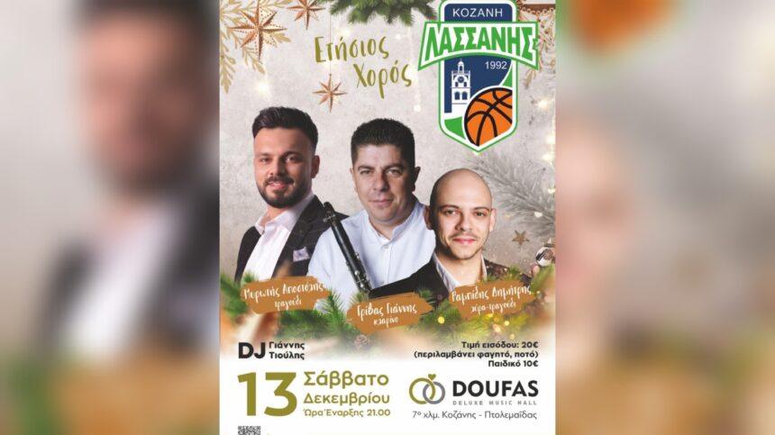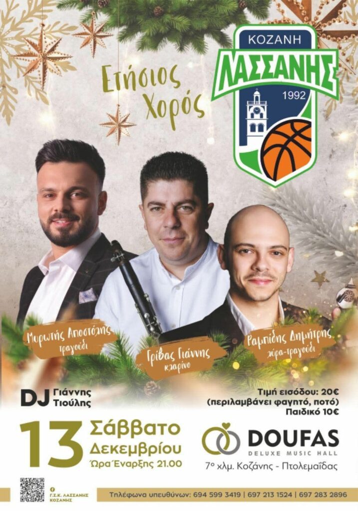 Ο Γ.Σ.Κ. Λασσάνης Κοζάνης με χαρά σας προσκαλεί στον ετήσιο χορό του, που θα πραγματοποιηθεί το  Σάββατο 13 Δεκεμβρίου και ώρα 21:00 στο DOUFAS • Deluxe Music Hall. (Doufas • deluxe music hall).