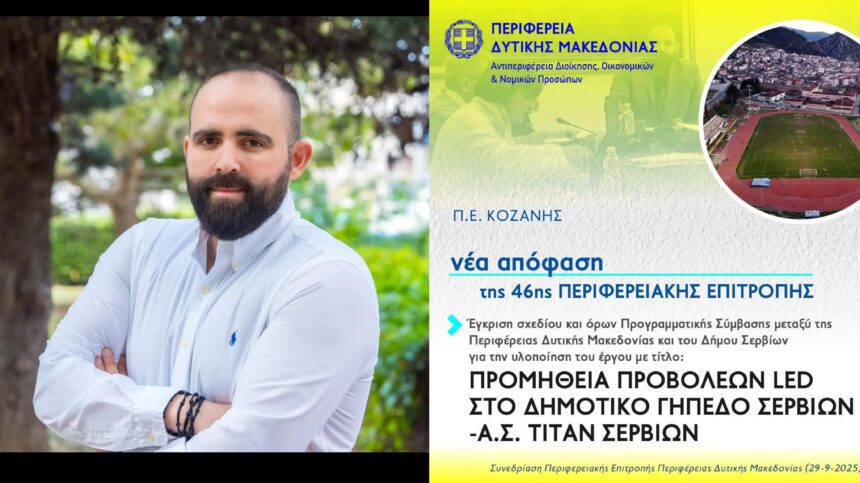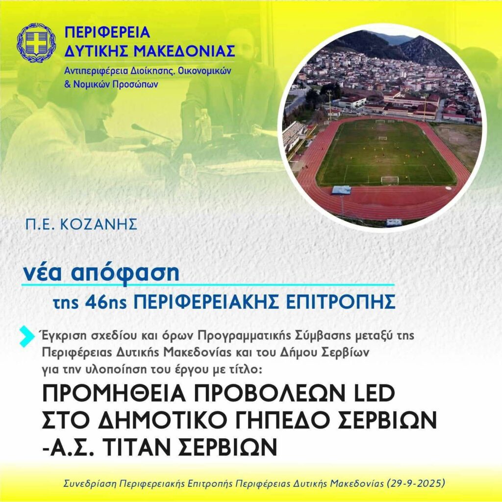 Περιφέρεια Δυτικής Μακεδονίας «Προμήθεια Προβολέων LED στο Δημοτικό Γήπεδο Σερβίων – Α.Σ.Τιτάν Σερβίων