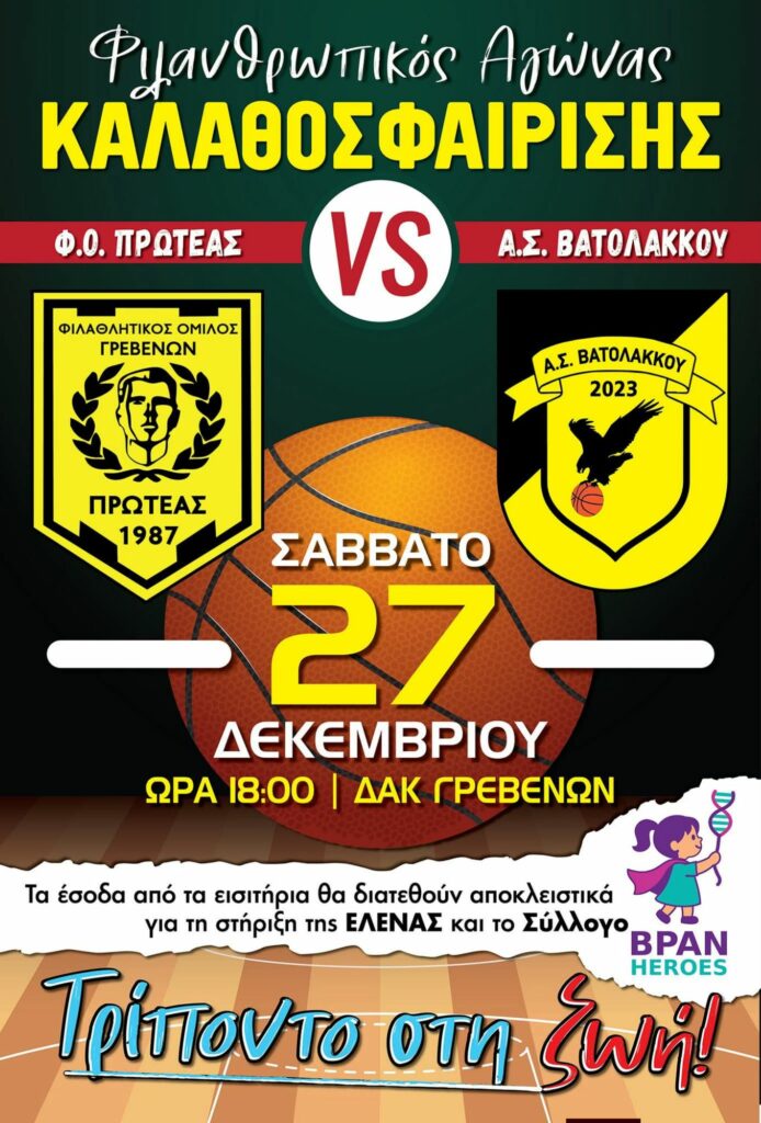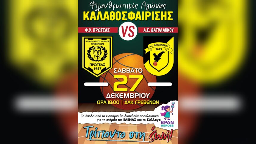 Στο πλαίσιο αυτό o Φ.Ο. ΠΡΩΤΕΑΣ ΓΡΕΒΕΝΩΝ και ο Α.Σ. ΒΑΤΟΛΑΚΚΟΥ ανέλαβαν την πρωτοβουλία για τη διοργάνωση ενός φιλανθρωπικού αγώνα με στόχο ,την αλληλεγγύη και τη φιλανθρωπία την ενίσχυση δύο νέων παιδιών που αυτή τη στιγμή μας έχουν ανάγκη.