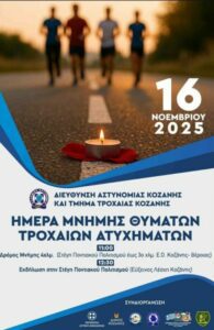 Η Τοπική Διοίκηση Κοζάνης της Διεθνούς Ένωσης Αστυνομικών θα συμμετάσχει και φέτος σε διάφορες δράσεις (αγώνας δρόμου-βαδίσματος και εκδήλωση μνήμης- ευαισθητοποίησης), με αφορμή την «Παγκόσμια Ημέρα Μνήμης για τα Θύματα Τροχαίων Ατυχημάτων», με σκοπό να τιμήσει τη μνήμη όσων έχασαν τη ζωή τους από Τροχαία Δυστυχήματα.