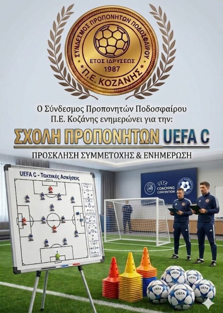 Ο Σύνδεσμος Προπονητών Ποδοσφαίρου Π.Ε. Κοζάνης (ΣΠΠ Π.Ε. Κοζάνης) ενημερώνει κάθε ενδιαφερόμενο/η, σύμφωνα και με την επίσημη ανακοίνωση της Ε.Π.Ο. και της Ε.Π.Σ. Κοζάνης, για τη λειτουργία Σχολής Προπονητών Ποδοσφαίρου διπλώματος UEFA C.Η Σχολή θα πραγματοποιηθεί σε συνεργασία με την Ελληνική Ποδοσφαιρική Ομοσπονδία (Ε.Π.Ο.) και αφορά τις Ποδοσφαιρικές Ενώσεις Κοζάνης και Φλώρινας.