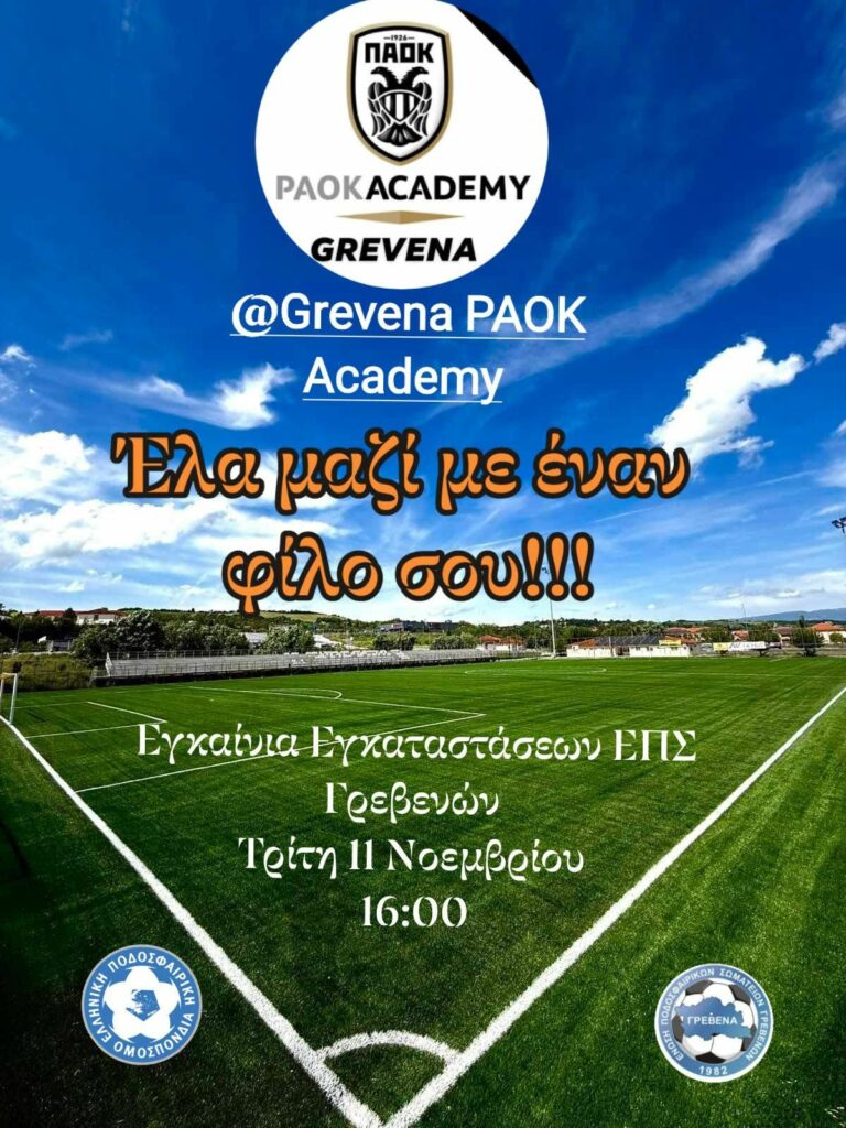 Η Grevena PAOK Academy ,στα πλαίσια των εγκαινίων των εγκαταστάσεων της ΕΠΣ Γρεβενών,καλεί όλους τους μικρούς αθλητές της περιοχής στα παιχνίδια που θα διεξαχθούν με στόχο να γνωρίσετε την Ακαδημία μας και τις νέες σύγχρονες εγκαταστάσεις που μας φιλοξενούν.
