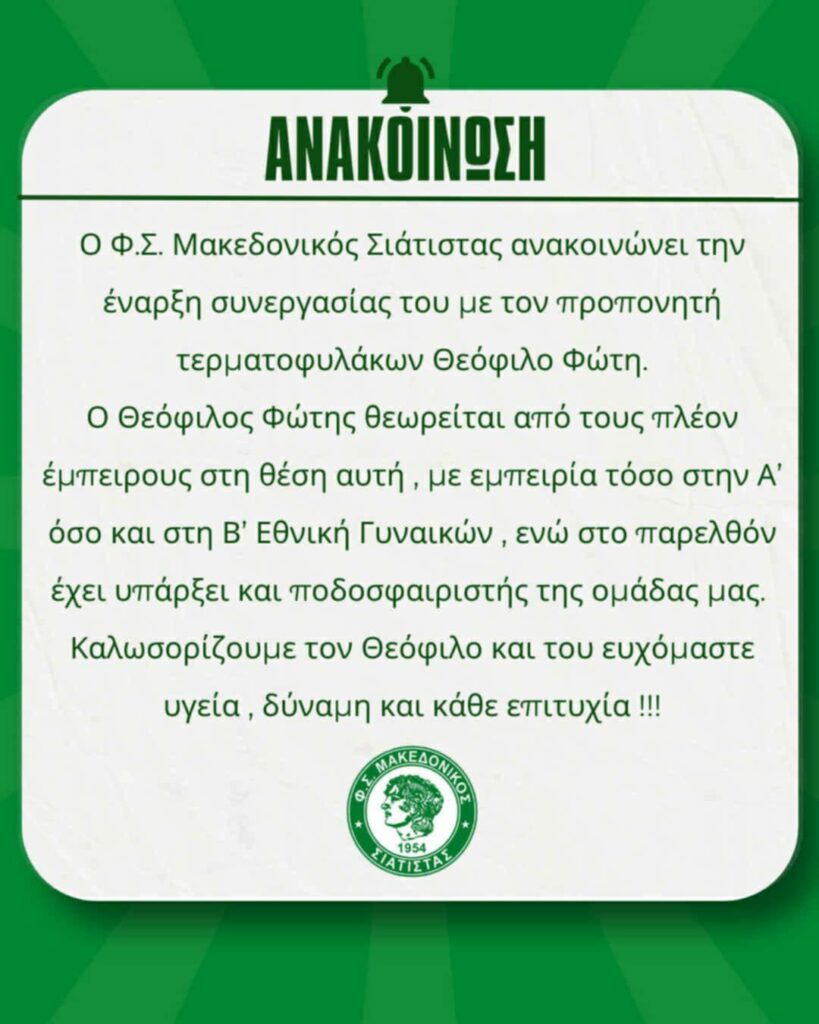 Ο.Μακεδονικος Σιάτιστας με ανακοίνωση γνωστοποιεί την έναρξη συνεργασίας με τον Θεόφιλο Φώτη προπονητή τερματοφυλάκων.