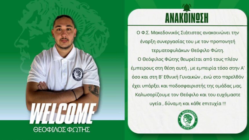 Ο.Μακεδονικος Σιάτιστας με ανακοίνωση γνωστοποιεί την έναρξη συνεργασίας με τον Θεόφιλο Φώτη προπονητή τερματοφυλάκων.